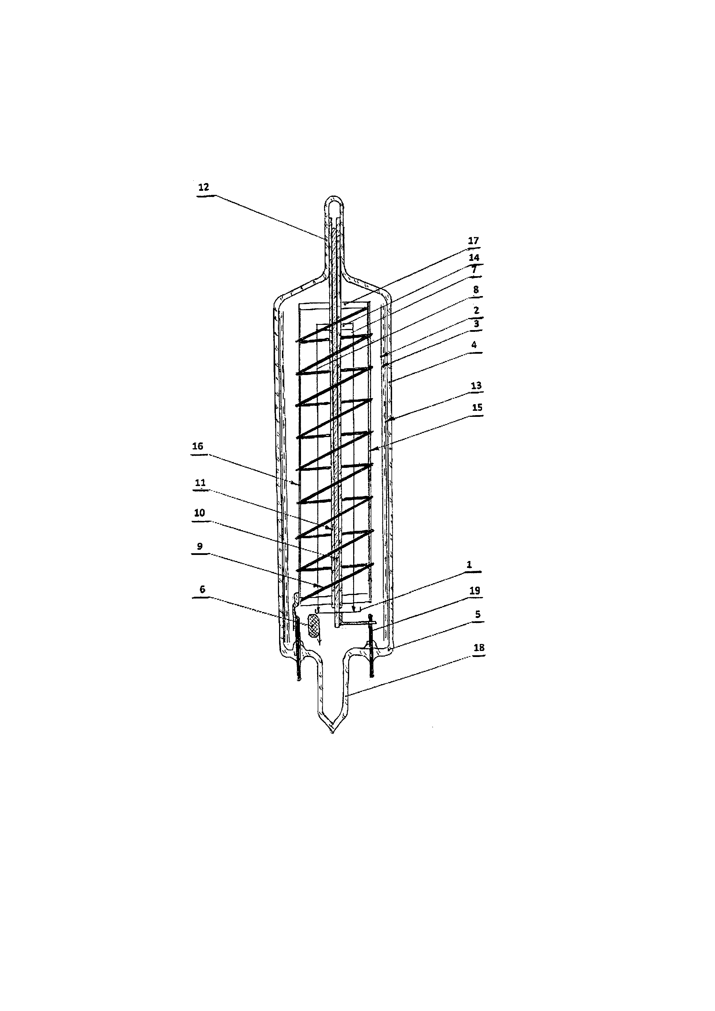 - v tsentre steklyannoy tsilindricheskoy kolbi lampi soosno s ney raspolozhen tsentralyniy metallicheskiy sterzheny v steklyannoy trubke, kotoraya soosno zakreplena v tsilindricheskiy zapayanniy sverhu steklyanniy nakonechnik kolbi;