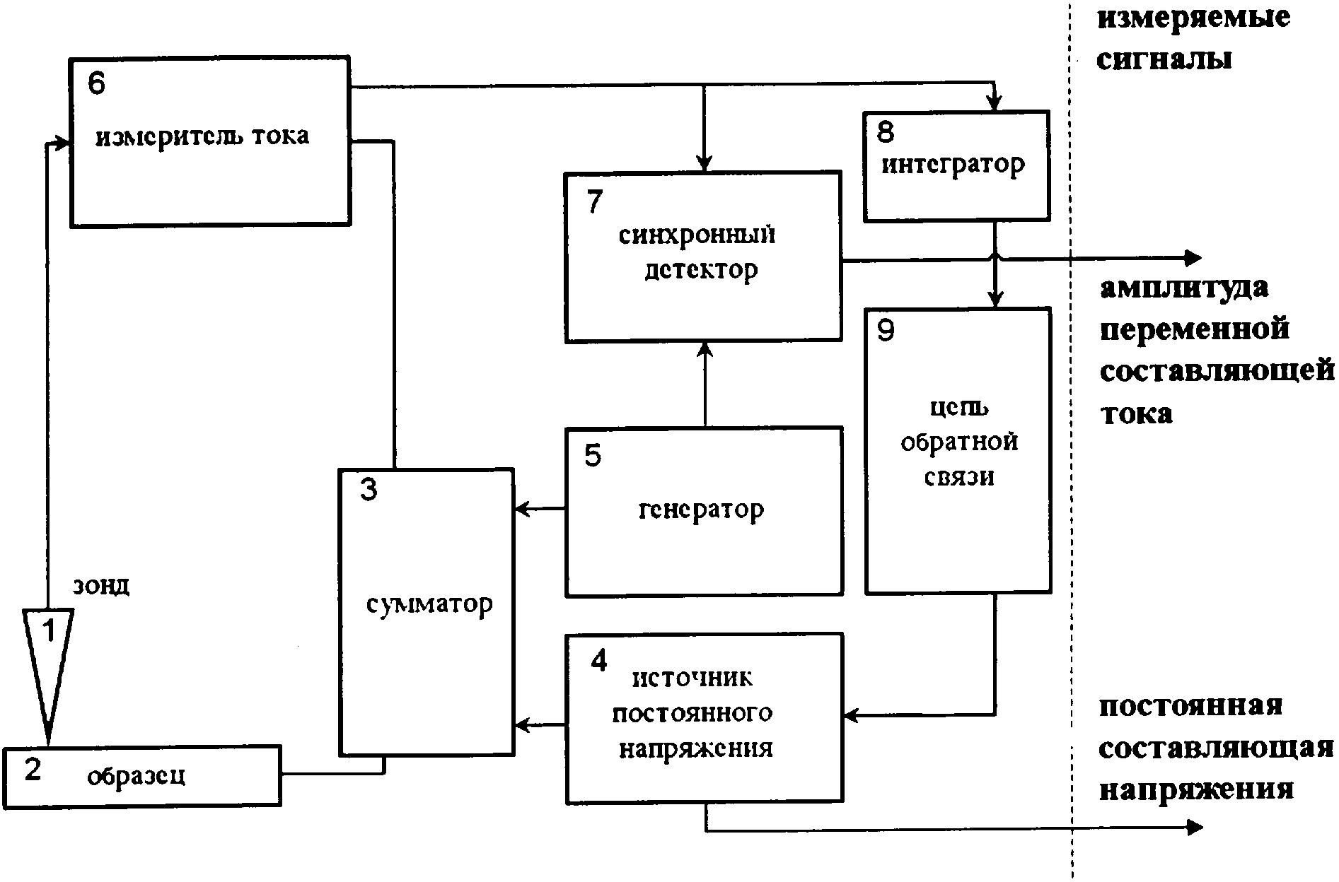 Na chertezhe izobrazhena shema realizatsii predlagaemogo sposoba pri pomoshti atomno-silovogo mikroskopa. Zond poz.1 kantilevernogo tipa, libo zond lyuboy drugoy konstruktsii, pozvolyayushtiy rabotaty v atomno-silovom rezhime, pokrit provodyashtim pokritiem, libo sdelan iz poluprovodnikovogo materiala s visokoy kontsentratsiey legiruyushtih primesey, chtobi obespechity provodimosty zonda. Zond poz.1 prizhat k poverhnosti issleduemogo obraztsa poz.2 s postoyannoy siloy. Na summator poz.3 podayut postoyannoe napryazhenie pri pomoshti istochnika postoyannogo napryazheniya poz.4 i peremennoe napryazhenie pri pomoshti generatora poz.5 s amplitudoy ot 0.1 do 5 volyt. Napryazhenie s vihoda summatora poz.3 prikladivayut mezhdu zondom poz.1 i obraztsom poz.2. Tok, protekayushtiy cherez zond, izmeryayut pri pomoshti izmeritelya toka poz.6. Amplituda peremennoy sostavlyayushtey toka registriruetsya pri pomoshti sinhronnogo detektora poz.7, na kotoriy s generatora poz.5 podayut oporniy signal. Pri pomoshti integratora poz.8 vichislyayut srednee znachenie toka, protekayushtego cherez zond. Tsepy obratnoy svyazi poz.9, kotoraya mozhet bity kak programmnoy, tak i apparatnoy, podderzhivaet srednee znachenie toka postoyannim, izmenyaya velichinu postoyannogo napryazheniya. Velichina srednego toka, kotoraya podderzhivaetsya postoyannoy, zadaetsya operatorom. Pri etom velichina napryazheniya, kotoroe trebuetsya dlya uderzhaniya zadannogo srednego znacheniya toka, proportsionalyna kontaktnomu soprotivleniyu. Kontaktnoe soprotivlenie vichislyayut kak otnosheniya postoyannogo napryazheniya k velichine uderzhivaemogo srednego znacheniya toka. Amplituda peremennoy sostavlyayushtey toka proportsionalyna differentsialynomu kontaktnomu soprotivleniyu. Differentsialynoe kontaktnoe soprotivlenie vichislyayut kak otnoshenie amplitudi peremennoy sostavlyayushtey napryazheniya, prilozhennogo mezhdu zondom i obraztsom, k amplitude peremennoy sostavlyayushtey toka. Pri etom chastota peremennogo napryazheniya, podavaemogo s generatora poz.5, dolzhna bity dostatochno visokoy, chtobi ne meshaty rabote obratnoy svyazi, uderzhivayushtey postoyannoe srednee znachenie toka. Srednee znachenie toka, uderzhivaemoe postoyannim, zadaetsya dostatochno nizkim, chtobi izbezhaty modifikatsii issleduemoy poverhnosti ili zonda. Peremeshtaya zond poz.1 nad poverhnostyyu issleduemogo obraztsa poz.2, i izmeryaya polnoe i differentsialynoe kontaktnoe soprotivlenie opisannim vishe sposobom posledovatelyno v kazhdoy tochke obraztsa, stroyat kartu raspredeleniya postoyannoy sostavlyayushtey napryazheniya i amplitudi peremennoy sostavlyayushtey toka, libo kartu raspredeleniya polnogo i differentsialynogo kontaktnogo soprotivleniya.